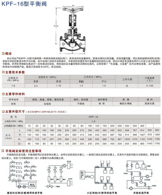 KPF手動(dòng)流量平衡閥技術(shù)參數(shù) 公稱壓力:1.6MPa 公稱通徑:15~600mm 適用介質(zhì):水、油等非腐蝕性液體 適用溫度:0~100℃ 法蘭標(biāo)準(zhǔn):GB/T 17241.6GB/T 9113 試驗(yàn)標(biāo)準(zhǔn):GB/T 13927API598