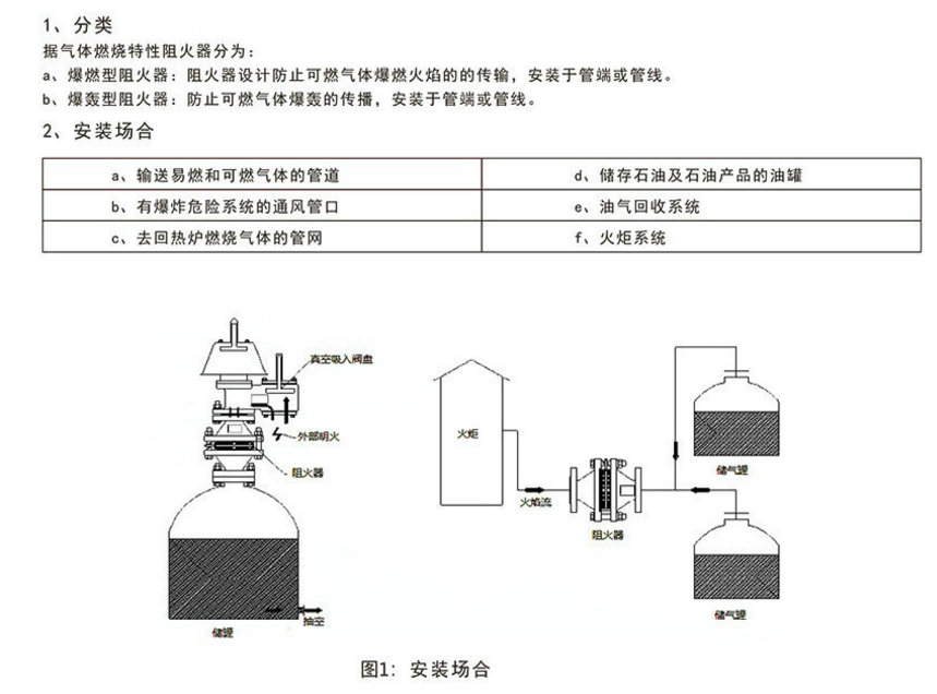 1、輸送可燃性氣體的管道上。 2、火炬系統(tǒng)。 3、油氣回收系統(tǒng)。 4、加熱爐燃料氣的管網(wǎng)上。 5、氣體凈化通化系統(tǒng)。 6、氣體分析系統(tǒng)。 7、氣體排放系統(tǒng)。主要性能1、阻火器連續(xù)13次以亞音速火焰試驗(yàn),每次都能阻止火焰的通過。 5、水壓試驗(yàn)2.4MPa無滲漏。