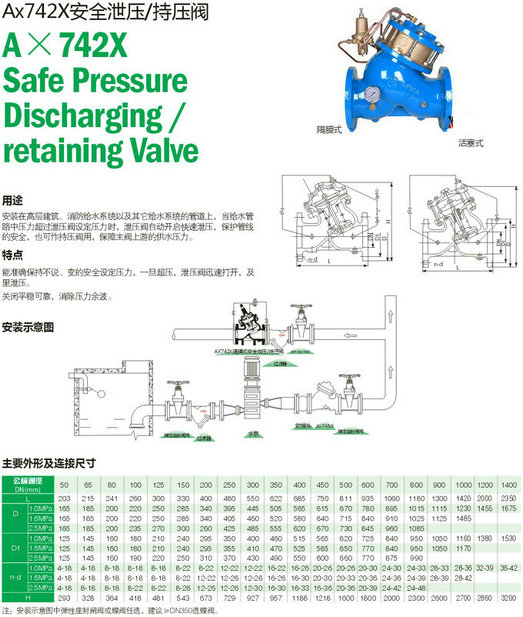 AX742X活塞式安全泄壓閥工作原理:當(dāng)系統(tǒng)里壓力超過(guò)安全泄壓閥設(shè)定壓力時(shí),安全泄壓閥就會(huì)自動(dòng)開(kāi)啟幫助系統(tǒng)降壓,知道系統(tǒng)壓力低于設(shè)定值。閥門(mén)自動(dòng)關(guān)閉。 由主閥和針型調(diào)節(jié)閥、導(dǎo)閥、球閥及接管系統(tǒng)組成,主閥閥體采用全通道、直流式、流線型設(shè)計(jì),并采用膜片式或活塞式兩類(lèi)結(jié)構(gòu)。本產(chǎn)品利用設(shè)定調(diào)壓導(dǎo)閥彈簧壓力和調(diào)節(jié)針型閥開(kāi)度設(shè)定出口壓力,并通過(guò)接管系統(tǒng)和控制室的反饋?zhàn)饔脕?lái)穩(wěn)定出口壓力。 安全泄壓閥,活塞式安全泄壓閥利用針型調(diào)節(jié)閥、導(dǎo)閥進(jìn)行水壓自力控制,不需要附加其它裝置和能源,維護(hù)保養(yǎng)簡(jiǎn)便,受進(jìn)口壓力和流量影響小,壓力控制準(zhǔn)確度高,減壓穩(wěn)壓可靠。
