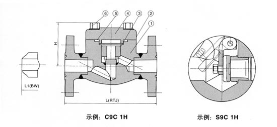 注意:客戶需求的其他材質(zhì)也可采用。密封面材料配對由客戶指定內(nèi)件代號決定。 CS=碳鋼;AS=合金鋼;SS=不銹鋼; 4.【鍛鋼法蘭止回閥】鍛鋼法蘭止回閥尺寸(mm)和重量(Kg) NPS | 1/2 | 3/4 | 1 | 11/4 | 11/2 | 2 | L(RTJ) L1(BW) | 150 | 108 | 117 | 127 | 140 | 165 | 203 | 300 | 152 | 178 | 203 | 216 | 229 | 267 | 600 | 165 | 190 | 216 | 229 | 241 | 292 | H | 150,300 | 61 | 61 | 79 | 95 | 103 | 118 | 600 | 61 | 79 | 95 | 103 | 118 | 135 | 重量 | 150 | RTJ | 2.56 | 3.37 | 4.37 | 8.17 | 8.94 | 12.64 | BW | 1.70 | 1.90 | 2.10 | 5.12 | 5.50 | 7.89 | 300 | RTJ | 2.73 | 3.65 | 4.74 | 8.77 | 9.60 | 13.70 | BW | 1.90 | 2.10 | 3.00 | 5.12 | 6.60 | 7.85 | 600 | RTJ | 3.00 | 4.00 | 5.83 | 9.47 | 10.10 | 15.6 | BW | 2.00 | 3.12 | 4.25 | 7.25 | 8.56 | 13.60 |