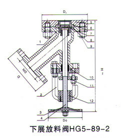 4.【下展式放料閥】主要零件材料 1. 閥體 2. 支架:ZG1Cr18Ni9Ti、CF8(304)、CF3(304L)、ZG1Cr18Ni12Mo2Ti、CF8M(316)、WCB 3. 手輪:可鍛鑄鐵球墨鑄鐵或鋼 4. 閥桿 5. 法蘭:1Cr18Ni9Ti、00Cr19Ni11(304L)、1Cr18Ni12Mo2Ti、2Cr13、Cr17Ni14Mo2(316L)、00Cr17Ni17Mo2(316L) 6. 閥瓣 7. 密封圈 8. 螺栓、螺母:1Cr17Ni2、35CrMoA、1Cr18Ni9Ti、45 9. 墊片 10. 填料:聚四氟乙烯片、柔性石墨環(huán)、柔性石墨纏繞墊 11. 填料壓蓋:WCB、1Cr18Ni9Ti、0Cr18Ni9(304)、00Cr19Ni11(304L)、1Cr18Ni12Mo2Ti、2Cr13、0Cr17Ni12Mo2(316L) 12. 閥桿螺母:銅 5.【下展式放料閥】主要外形尺寸(法蘭尺寸按JB79PN1.6Mpa) 口徑 | | | | | | | | | DN | D | D3 | H | D0 | D | D3 | H | D0 | 25 | 115 | 115 | 270 | 160 | 115 | 135 | 225 | 160 | 32 | 135 | 135 | 285 | 160 | 135 | 145 | 300 | 160 | 40 | 145 | 145 | 355 | 180 | 145 | 160 | 340 | 180 | 50 | 160 | 160 | 370 | 180 | 160 | 180 | 345 | 180 | 65 | 180 | 180 | 465 | 220 | 180 | 195 | 425 | 220 | 80 | 195 | 195 | 480 | 250 | 195 | 215 | 445 | 250 | 100 | 215 | 215 | 590 | 280 | 215 | 260 | 535 | 280 | 125 | 245 | 245 | 730 | 300 | 245 | 280 | 585 | 300 | 150 | 280 | 280 | 775 | 320 | 280 | 335 | 665 | 320 | 200 | 335 | 335 | 900 | 360 | 335 | 405 | 800 | 360 | 250 | 405 | 405 | 1035 | 500 | 405 | 460 | 945 | 500 |