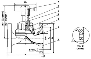 【無襯里隔膜閥G41W】-上海浦蝶閥門有限公司 【無襯里隔膜閥G41W】用于控制非腐蝕性或一般腐蝕性介質(zhì),閥體內(nèi)腔表面無襯里或覆有可供選擇的各種橡膠、適用于不同工作溫度和液體管路。 適用溫度:≤85℃、≤100℃、≤120℃、≤150℃ 壓力等級(jí):PN(MPa) 0.6 1.0 1.6 1.【無襯里隔膜閥】主要部件及材料: 閥體:鑄鐵、球墨鑄鐵、碳鋼、不銹鋼 閥蓋:鑄鐵、球墨鑄鐵、碳鋼、不銹鋼 襯里:無襯里、橡膠 隔膜:橡膠 閥瓣:鑄鐵 閥桿:碳鋼、不銹鋼 手輪:鑄鐵 2.【無襯里隔膜閥】實(shí)驗(yàn)測(cè)試: 襯里層:電火花檢測(cè) 試驗(yàn)與檢驗(yàn)按BS6755標(biāo)準(zhǔn) 公稱壓力:PN(MPa) 閥體:PN×1.5 密封:PN×1.1 3.【無襯里隔膜閥】結(jié)構(gòu)特點(diǎn): 隔膜閥是一種特殊形式的截?cái)嚅y: 1、彈性密封的開閉件,確保沒有內(nèi)漏; 2、流線型的流道,使得壓力損失小; 3、沒有填料函,因此沒有外漏; 4、閥體與蓋被中間隔膜隔開,使得隔膜上方的閥蓋,閥桿等零件不受介質(zhì)侵蝕; 5、隔膜可更換,維護(hù)費(fèi)用低; 6、襯里材料的多樣性,可適用于各種介質(zhì),并具有強(qiáng)度高、耐腐蝕性能好的特點(diǎn)。 4.【無襯里隔膜閥】主要連接尺寸: 公稱通徑 DN | 公稱壓力 MPa | 工作壓力 MPa | L mm | D mm | D1 mm | n-Фd mm | f mm | H1 mm | H2 mm | D0 mm | 質(zhì)量 Kg/kilos | 15 | 1.6 | 1.6 | 108 | 95 | 65 | 4-14 | 2 | 90 | 99 | 66 | 2 | 20 | 117 | 105 | 75 | 4-14 | 2 | 93 | 103 | 66 | 3 | 25 | 127 | 115 | 85 | 4-14 | 2 | 100 | 112 | 66 | 4 | 32 | 146 | 140 | 100 | 4-18 | 2 | 127 | 144 | 96 | 6.5 | 40 | 159 | 150 | 110 | 4-18 | 2 | 136 | 56 | 96 | 7.5 | 50 | 190 | 165 | 125 | 4-18 | 2 | 151 | 177 | 96 | 10 | 65 | 1.0 | 1.0 | 216 | 185 | 145 | 4-18 | 2 | 183 | 213 | 165 | 16 | 80 | 254 | 200 | 160 | 8-18 | 2 | 190 | 230 | 230 | 23.5 | 100 | 305 | 220 | 180 | 8-18 | 2 | 242 | 285 | 280 | 34 | 125 | 356 | 250 | 210 | 8-18 | 3 | 285 | 648 | 280 | 44 | 150 | 406 | 285 | 240 | 8-22 | 3 | 353 | 431 | 368 | 67.5 | 200 | 0.6 | 521 | 340 | 295 | 8-22 | 3 | 445 | 537 | 483 | 141.5 | 250 | 635 | 395 | 350 | 12-22 | 5 | 598 | 734 | 500 | 229 | 300 | 0.4 | 749 | 445 | 400 | 12-22 | 5 | 698 | 778 | 560 | 321 | 350 | 787 | 505 | 460 | 16-22 | 5 | 723 | 883 | 560 | 360 | 400 | 0.25 | 914 | 565 | 515 | 16-26 | 5 | 868 | 1078 | 640 | 584 |