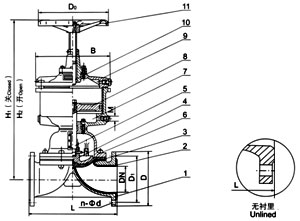 部件列表: 1、閥體 2、閥體襯里 3、隔膜 4、閥瓣 5、下閥桿 6、閥蓋 7、氣缸 8、活塞 9、氣缸蓋 10、上閥桿 11、手輪設計與制造:GB122239 結構長度:GB12221、JB1688 法蘭連接尺寸:GB4216、JB78