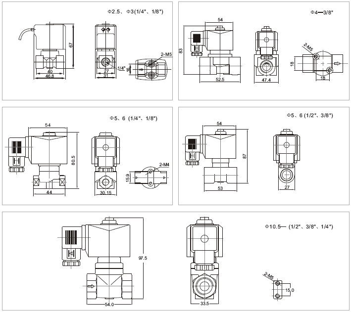 | 接管口徑 | 流量通徑mm | CV值 | 壓力差(Kgf/cm2) | 最大溫度℃ | 線圈配置 | 功率 | 線圈等級(jí) | 訂貨型號(hào)規(guī)格以下表中 型號(hào)規(guī)格電壓是220VAC | 重量KG | | 最小壓力 | 最大工作壓力 | VA | W | | 空氣瓦斯 | 水、熱水液體 | 輕油≤20CST | AC220V | DC24V | 閥體材料 | | AC | DC | AC | DC | AC | DC | 鍛銅 | 不銹鋼SS304 | 1/8” 只配 N05型線圈 | 2.5 | 0.23 | 0 | 7 | 5 | 7 | 5 | 7 | 5 | 80 | N | 13 | 8.5 | B | ZS1NF02N1AC3 | ZS1NF02N4AC3 | 0.35 | | 2.5 | 0.23 | 0 | 7 | 5 | 7 | 5 | | | 120 | N | 13 | 8.5 | B | ZS1NF02E1AC3 | ZS1NF02E4AC3 | 0.35 | | 2.5 | 0.23 | 0 | 7 | 5 | 7 | 5 | 7 | 5 | 120 | N | 13 | 8.5 | B | ZS1NF02V1AC3 | ZS1NF02V4AC3 | 0.35 | | 3 | 0.3 | 0 | 5 | 4 | 5 | 4 | 5 | 4 | 80 | N | 13 | 8.5 | B | ZS1NF02N1AC3 | ZS1NF02N4AC3 | 0.35 | | 3 | 0.3 | 0 | 5 | 4 | 5 | 4 | | | 120 | N | 13 | 8.5 | B | ZS1NF02E1AC3 | ZS1NF02E4AC3 | 0.35 | | 3 | 0.3 | 0 | 5 | 4 | 5 | 4 | 5 | 4 | 120 | N | 13 | 8.5 | B | ZS1NF02V1AC3 | ZS1NF02V4AC3 | 0.35 | | 1/8” | 5 | 0.65 | 0 | 6 | 4 | 6 | 4 | 4 | 3 | 80 | D | 33 | 20 | F | ZS1DF02N1A05 | ZS1DF02N4A05 | 0.46 | | 5 | 0.65 | 0 | 6 | 4 | 6 | 4 | | | 120 | D | 33 | 20 | F | ZS1DF02E1A05 | ZS1DF02E4A05 | 0.46 | | 5 | 0.65 | 0 | 6 | 4 | 6 | 4 | 4 | 3 | 120 | D | 33 | 20 | F | ZS1DF02V1A05 | ZS1DF02V4A05 | 0.46 | | 6 | 0.8 | 0 | 4 | 2.5 | 4 | 2.5 | 3 | 2.5 | 80 | D | 33 | 20 | F | ZS1DF02N1A06 | ZS1DF02N4A06 | 0.46 | | 6 | 0.8 | 0 | 4 | 2.5 | 4 | 2.5 | | | 120 | D | 33 | 20 | F | ZS1DF02E1A06 | ZS1DF02E4A06 | 0.46 | | 6 | 0.8 | 0 | 4 | 2.5 | 4 | 2.5 | 3 | 2.5 | 120 | D | 33 | 20 | F | ZS1DF02V1A06 | ZS1DF02V4A06 | 0.46 | | 7.5 | 1.0 | 0 | 1.5 | 1 | 1.5 | 1 | 1.5 | 1 | 80 | D | 33 | 20 | F | ZS1DF02N1AC8 | ZS1DF02N4AC8 | 0.45 | | 7.5 | 1.0 | 0 | 1.5 | 1 | 1.5 | 1 | | | 120 | D | 33 | 20 | F | ZS1DF02E1AC8 | ZS1DF02E4AC8 | 0.45 | | 7.5 | 1.0 | 0 | 1.5 | 1 | 1.5 | 1 | 1.5 | 1 | 120 | D | 33 | 20 | F | ZS1DF02V1AC8 | ZS1DF02V4AC8 | 0.45 | 1/4” 只配 N05型線圈 | 2.5 | 0.23 | 0 | 7 | 5 | 7 | 5 | 7 | 5 | 80 | N | 13 | 20 | B | ZS1NF02N1BC3 | ZS1NF02N4BC3 | 0.34 | | 2.5 | 0.23 | 0 | 7 | 5 | 7 | 5 | | | 120 | N | 13 | 8.5 | B | ZS1NF02E1BC3 | ZS1NF02E4BC3 | 0.34 | | 2.5 | 0.23 | 0 | 7 | 5 | 7 | 5 | 7 | 5 | 120 | N | 13 | 8.5 | B | ZS1NF02V1BC3 | ZS1NF02V4BC3 | 0.34 | | 3 | 0.3 | 0 | 5 | 4 | 5 | 4 | 5 | 4 | 80 | N | 13 | 8.5 | B | ZS1NF02N1BC3 | ZS1NF02N4BC3 | 0.34 | | 3 | 0.3 | 0 | 5 | 4 | 5 | 4 | | | 120 | N | 13 | 8.5 | B | ZS1NF02E1BC3 | ZS1NF02E4BC3 | 0.34 | | 3 | 0.3 | 0 | 5 | 4 | 5 | 4 | 5 | 4 | 120 | N | 13 | 8.5 | B | ZS1NF02V1BC3 | ZS1NF02V4BC3 | 0.34 | | 1/4” | 5 | 0.65 | 0 | 6 | 4 | 6 | 4 | 4 | 3 | 80 | D | 33 | 8.5 | F | ZS1DF02N1B05 | ZS1DF02N4B05 | 0.45 | | 5 | 0.65 | 0 | 6 | 4 | 6 | 4 | | | 120 | D | 33 | 20 | F | ZS1DF02E1B05 | ZS1DF02E4B05 | 0.45 | | 5 | 0.65 | 0 | 6 | 4 | 6 | 4 | 4 | 3 | 120 | D | 33 | 20 | F | ZS1DF02V1B05 | ZS1DF02V4B05 | 0.45 | | 6 | 0.8 | 0 | 4 | 2.5 | 4 | 2.5 | 3 | 2.5 | 80 | D | 33 | 20 | F | ZS1DF02N1B06 | ZS1DF02N4B06 | 0.45 | | 6 | 0.8 | 0 | 4 | 2.5 | 4 | 2.5 | | | 120 | D | 33 | 20 | F | ZS1DF02E1B06 | ZS1DF02E4B06 | 0.45 | | 6 | 0.8 | 0 | 4 | 2.5 | 4 | 2.5 | 3 | 2.5 | 120 | D | 33 | 20 | F | ZS1DF02V1B06 | ZS1DF02V4B06 | 0.45 | | 7.5 | 1.0 | 0 | 1.5 | 1 | 1.5 | 1 | 1.5 | 1 | 80 | D | 33 | 20 | F | ZS1DF02N1BC8 | ZS1DF02N4BC8 | 0.44 | | 7.5 | 1.0 | 0 | 1.5 | 1 | 1.5 | 1 | | | 120 | D | 33 | 20 | F | ZS1DF02E1BC8 | ZS1DF02E4BC8 | 0.44 | | 7.5 | 1.0 | 0 | 1.5 | 1 | 1.5 | 1 | 1.5 | 1 | 120 | D | 33 | 20 | F | ZS1DF02V1BC8 | ZS1DF02V4BC8 | 0.44 |