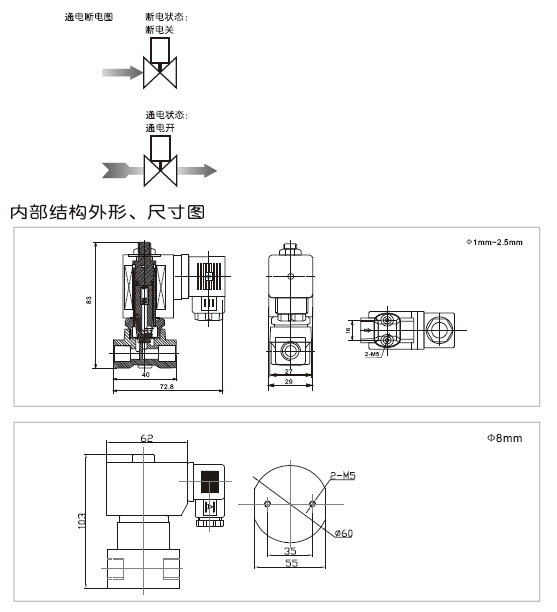 SLG系列二位二通高壓電磁閥(常閉型) 型號規(guī)格表 2.1接管 口徑 | 流量 通徑 mm | CV值 | 壓力差(Kgf/cm2) | 最大 流體 溫度 | 功率 | 訂貨型號 以下表中電壓為 220VAC 50/60HZ | 重量KG | 最小 壓力 | 最大工作壓力 | VA AC220V | W DC24V | 空氣 瓦斯 | 水、熱水液體 | 輕油≤20CST | 閥體材料 | | AC | DC | AC | DC | AC | DC | 鍛銅 | 不銹鋼 | | 1/8” | 1.0 | 0.04 | 0 | 100 | 75 | 100 | 75 | 100 | 75 | 110 | 24 | 18.5 | SLG1DF02V1A01 | SLG1DF02V1A01 | 0.43 | | 1.2 | 0.05 | 0 | 90 | 70 | 90 | 70 | 90 | 70 | 110 | 24 | 18.5 | SLG1DF02V1AC1 | SLG1DF02V1AC1 | 0.43 | | 1.5 | 0.08 | 0 | 75 | 50 | 75 | 50 | 75 | 50 | 110 | 24 | 18.5 | SLG1DF02V1AC2 | SLG1DF02V1AC2 | 0.43 | | 2.0 | 0.14 | 0 | 35 | 30 | 35 | 30 | 35 | 30 | 110 | 24 | 18.5 | SLG1DF02V1A02 | SLG1DF02V1A02 | 0.43 | | 2.5 | 0.23 | 0 | 20 | 15 | 20 | 15 | 20 | 15 | 110 | 24 | 18.5 | SLG1DF02V1AC3 | SLG1DF02V1AC3 | 0.43 | | 1/4” | 1.0 | 0.04 | 0 | 100 | 75 | 100 | 75 | 100 | 75 | 110 | 24 | 18.5 | SLG1DF02V1B01 | SLG1DF02V1B01 | 0.42 | | 1.2 | 0.05 | 0 | 90 | 70 | 90 | 70 | 90 | 70 | 110 | 24 | 18.5 | SLG1DF02V1BC1 | SLG1DF02V1BC1 | 0.42 | | 1.5 | 0.08 | 0 | 75 | 50 | 75 | 50 | 75 | 50 | 110 | 24 | 18.5 | SLG1DF02V1BC2 | SLG1DF02V1BC2 | 0.42 | | 2.0 | 0.14 | 0 | 35 | 30 | 35 | 30 | 35 | 30 | 110 | 24 | 18.5 | SLG1DF02V1B02 | SLG1DF02V1B02 | 0.42 | | 2.5 | 0.23 | 0 | 20 | 15 | 20 | 15 | 20 | 15 | 110 | 24 | 18.5 | SLG1DF02V1BC3 | SLG1DF02V1BC3 | 0.42 | | 8.0 | 1.0 | 0.5 | 90 | 70 | 90 | 70 | 70 | 50 | 80 | 35* | | SLG1DF02V1B08 | 1.26 | | 3/8” | 8.0 | 1.2 | 0.5 | 90 | 70 | 90 | 70 | 70 | 50 | 80 | 35* | SLG1DF02V1C08 | 1.24 | | 15 | 4.2 | 1.0 | 75 | 55 | 75 | 55 | 55 | 35 | 110 | 33 | 32 | SLG1DF02V1C15 | SLG1DF02V1C15 | 1.45 | | 1/2” | 8.0 | 1.2 | 0.5 | 90 | 70 | 90 | 70 | 70 | 50 | 80 | 35* | | SLG1DF02V1D08 | 1.21 | | 15 | 4.2 | 1.0 | 75 | 55 | 75 | 55 | 55 | 35 | 110 | 33 | 32 | SLG1DF02V1D15 | SLG1DF02V1D15 | 1.4 | | 3/4” | 20 | 7 | 1.0 | 65 | 50 | 65 | 50 | 50 | 30 | 110 | 33 | 32 | SLG1DF02V1E20 | SLG1DF02V1E20 | 1.7 | | 1” | 25 | 11 | 1.0 | 55 | 45 | 55 | 45 | 45 | 30 | 110 | 33 | 32 | SLG1DF02V1G25 | SLG1DF02V1G25 | 2.1 |