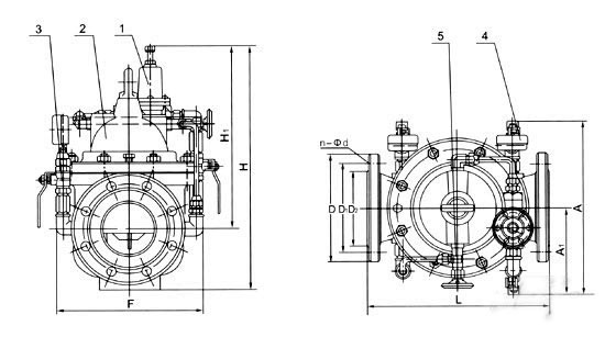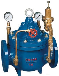 當(dāng)閥門從進口端給水時,水流過針閥進入主閥控制室,出口壓力通過導(dǎo)管作用到導(dǎo)閥上。當(dāng)出口壓力高于導(dǎo)閥彈簧設(shè)定值時,導(dǎo)閥關(guān)閉?刂剖彝V古潘,此時主閥控制室內(nèi)壓力升高并關(guān)閉主閥,出口壓力不再升高。 當(dāng)閥門出口壓力降到導(dǎo)閥彈簧設(shè)定壓力時,導(dǎo)閥開啟,控制室向下游排水。由于導(dǎo)閥系統(tǒng)排水量大于針閥的進水量,主閥控制室壓力下降。進口壓力使主閥開啟。在穩(wěn)定狀態(tài)下,控制室進水、排水相同,主閥開度不變,出口壓力穩(wěn)定。 調(diào)節(jié)導(dǎo)閥彈簧即可設(shè)定出口壓力。