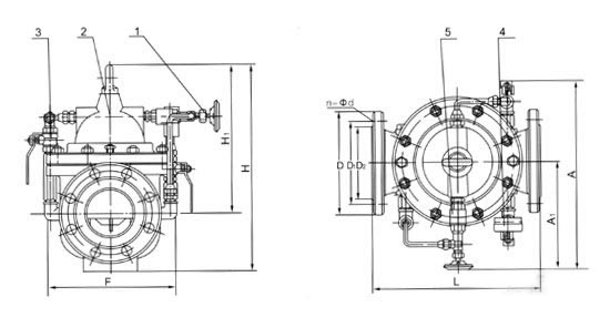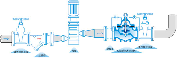 當(dāng)閥門從進(jìn)口端給水時(shí),水通過微型過濾器、針閥、單向閥進(jìn)入主閥控制室,再經(jīng)過球閥排水至下游。因?yàn)獒橀y開度小于球閥開度,即主閥控制室的排水速度大于進(jìn)水速度,因此控制室壓力降低,作用于主閥盤下端的進(jìn)口壓力打開主閥向下游供水。 當(dāng)管道停止供水時(shí),若下游水開始回流,一部分回流水經(jīng)球閥進(jìn)入主控制室,由于單向閥作用,回流水不能從主控制室流出,引起主控制室逐漸升壓,緩緩關(guān)閉主閥。 |