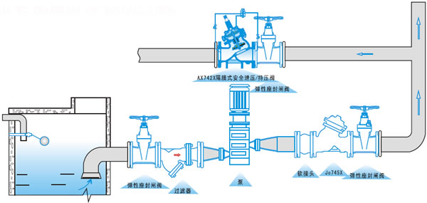 1.【安全泄壓閥AX742X】工作原理 當(dāng)管道從進水端給水時,水流過針閥進入主閥控制室,出口壓力通過導(dǎo)管作用到導(dǎo)閥上,當(dāng)出口壓力高于導(dǎo)閥設(shè)定值時,導(dǎo)閥關(guān)閉,控制室停止排水,此時主閥控制室內(nèi)壓力升高并關(guān)閉主閥,出口壓力不再升高。 當(dāng)出口壓力降到導(dǎo)閥設(shè)定壓力時導(dǎo)閥開啟,控制室向下游排水。由于導(dǎo)閥的排水量大于針閥的進水量,主閥控制室壓力下降,進口壓力使主閥開啟。穩(wěn)定狀態(tài)下,控制室進水、排水相同,開度不變,出口壓力不變。調(diào)節(jié)導(dǎo)閥彈簧即可設(shè)定出口壓力。