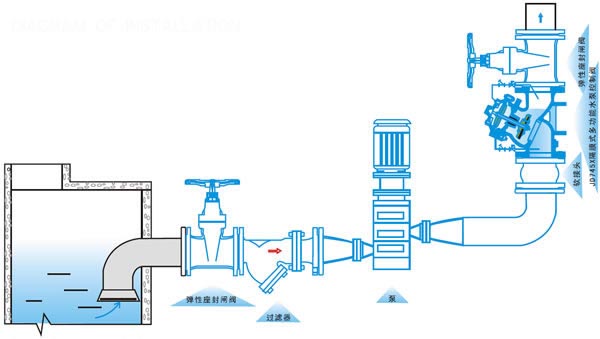 2.【多功能水泵控制閥】工作特點 1、防止水錘效果好,將緩開、止回速閉、緩閉等消除水錘的技術(shù)一體化,防止開泵不錘和停泵倒流與水錘對供水管路和水泵的損害。 2、操作方便,無需為閥門另配電控系統(tǒng),閥門隨水泵的開啟與停止自動并按順序完成控制功能。通過設(shè)定調(diào)節(jié)閥開度可得到合適的控制參數(shù)。 3、閥體采用了全通道、直流式、流線型設(shè)計。水力損失小,節(jié)能效果好。