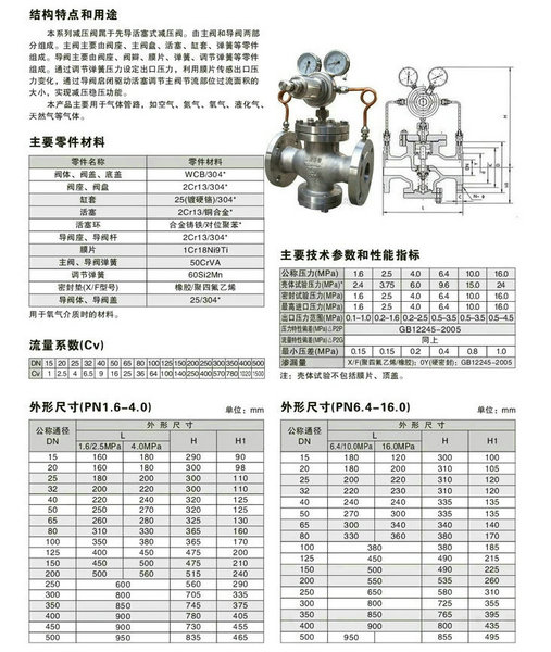 組成:空氣減壓閥屬于先導(dǎo)活塞式減壓閥。由主閥和導(dǎo)閥兩部分組成。主閥主要由閥座、主閥盤、活塞、彈簧等零件組成。導(dǎo)閥主要由閥座、閥瓣、膜片、彈簧、調(diào)節(jié)彈簧等零件組成。通過調(diào)節(jié)調(diào)節(jié)彈簧壓力設(shè)定出口壓力、利用膜片傳感出口壓力變化,通過導(dǎo)閥啟閉驅(qū)動活塞調(diào)節(jié)主閥節(jié)流部位過流面積的大小,實(shí)現(xiàn)減壓穩(wěn)壓功能。