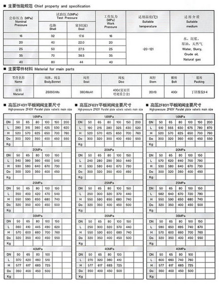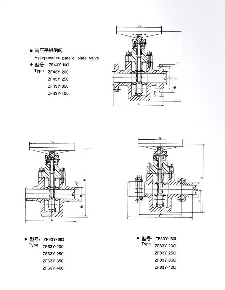 高壓平板閘閥ZF43Y,ZF63Y,Z83Y參數(shù)尺寸: