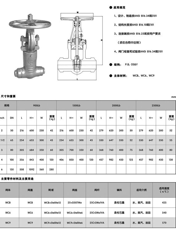 閥門(mén)類(lèi)型:高溫閘閥 閥門(mén)型號(hào):Z41H,Z61Y,Z60Y 尺寸規(guī)格:DN15-600mm 安裝形式:法蘭式 壓力等級(jí):1.6-32MPa 主體材質(zhì):鑄鋼WCB,WC6,WC9碳鋼CS,不銹鋼304,316等; 產(chǎn)品銘牌:浦蝶
