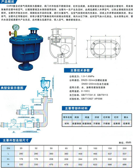 復合式排氣閥,CARX復合式排氣閥技術參數(shù)