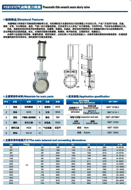 氣動陶瓷刀閘閥適于用高硬度的顆粒等介質(zhì),有軟顆粒但又有腐蝕性的介質(zhì)的管道上作啟閉之用。產(chǎn)品廣泛適用于灰渣、泥渣、煤漿、礦漿、污水等固體、液固、氣固二相介質(zhì)輸送系統(tǒng),尤其適用于火力發(fā)電廠石子煤系統(tǒng)。可采用手動、氣動和電動、電液聯(lián)動等驅(qū)動方式。氣動陶瓷刀閘閥閘板、閥座密封面材料采用結(jié)構(gòu)陶瓷制造,耐磨損、耐腐蝕、抗高溫、密封面采用硬密封與介質(zhì)接觸的部分均為結(jié)構(gòu)陶瓷材料,其化學(xué)穩(wěn)定性及硬度極高。因此,本閥具有極高的耐磨損、耐腐蝕、耐沖蝕性能,且隔熱性好、熱膨脹小。氣動陶瓷刀閘閥料口全流通無阻擋物,耐磨性能強,密封性能好,啟動負荷小卡灰及結(jié)灰現(xiàn)象少。采用高檔曾韌結(jié)構(gòu)陶瓷密封,機械強度高耐磨性能好使用壽命長,結(jié)構(gòu)緊湊可任意角度安裝。