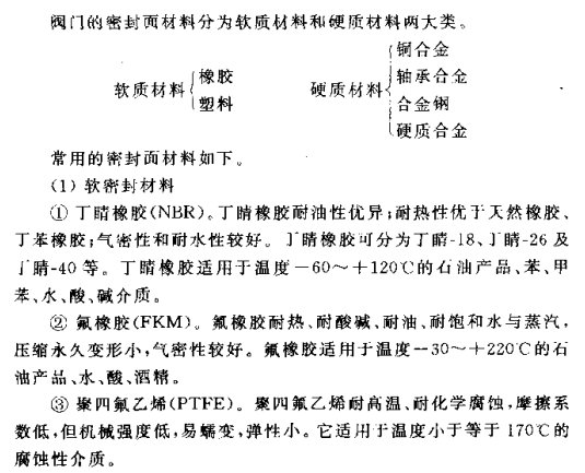(1)橡膠密封閥門:如丁晴橡膠,使用在水用閥門較多,如軟密封蝶閥、軟密封閘閥、軟密封隔膜閥等產(chǎn)品。橡膠密封閥門氣密性及耐水性好,使用溫度合適(為-60至120℃),可用于石油、苯、甲苯、酸堿及水類管路中使用的閥門,不適合用于高溫高壓管路。